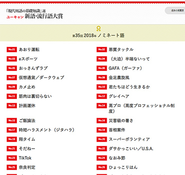 政治・社会関係からは酷暑、地震、豪雨など自然災害が多発したことに関連して「災害級の暑さ」や、全国各地の被災地で活躍する尾畠春夫さんの「スーパーボランティア」。また社会問題になった「あおり運転」「時短ハラスメント(ジタハラ)」。そして米国でハリウッドの大物プロデュ―サーのセクハラ疑惑告発をきっかけに広がったセクハラを告発する「#Me Too」も候補に挙がった。トップ10と大賞は12月3日に発表される。